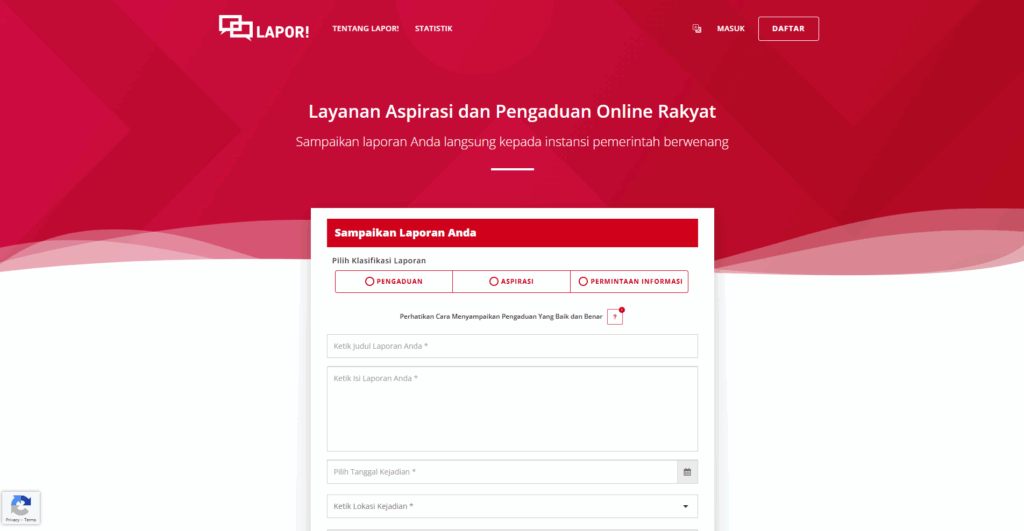 Warga dapat mengadukan laporan melalui SP4N-LAPOR!(Sistem Pengelolaan Pengaduan Pelayanan Publik Nasional – Layanan Aspirasi dan Pengaduan Online Rakyat), yaitu: